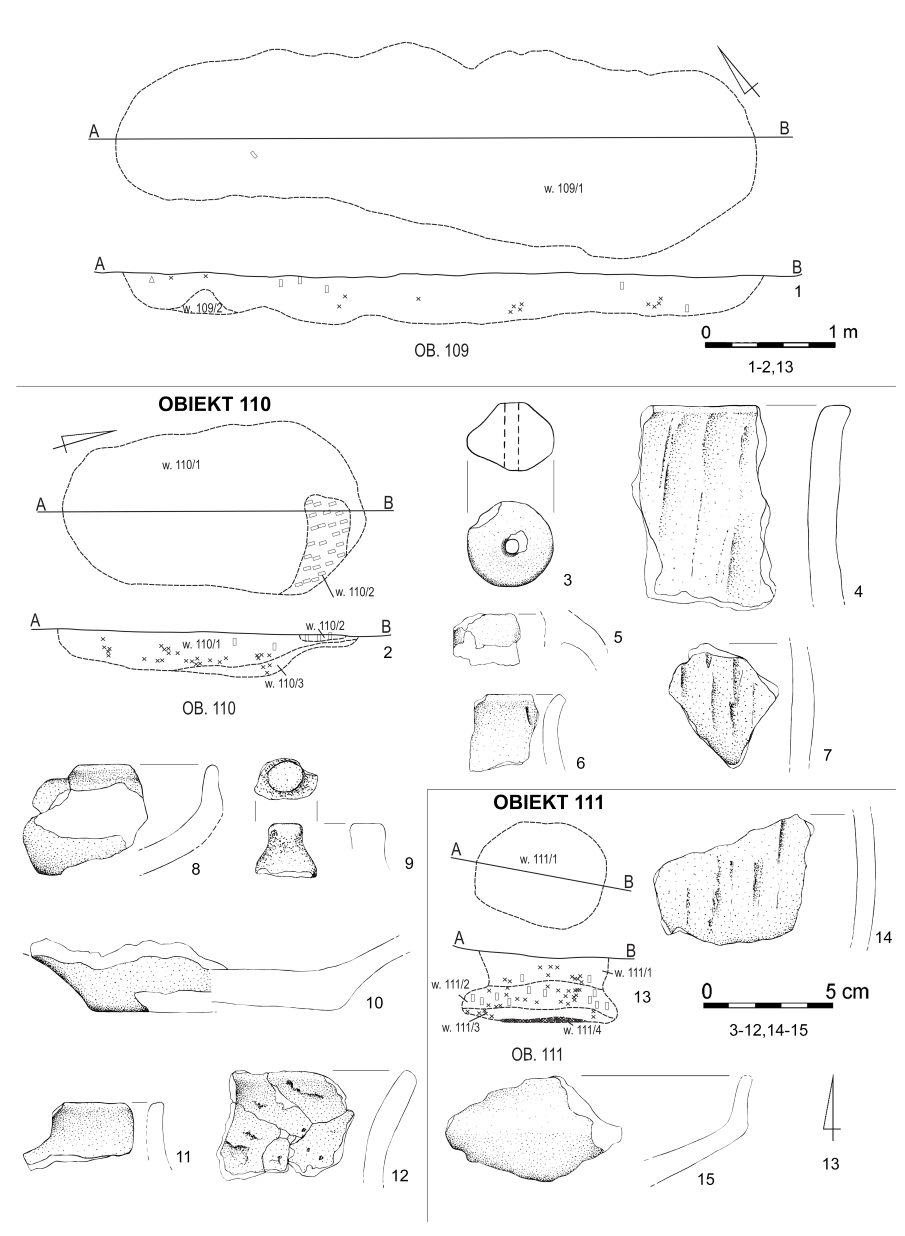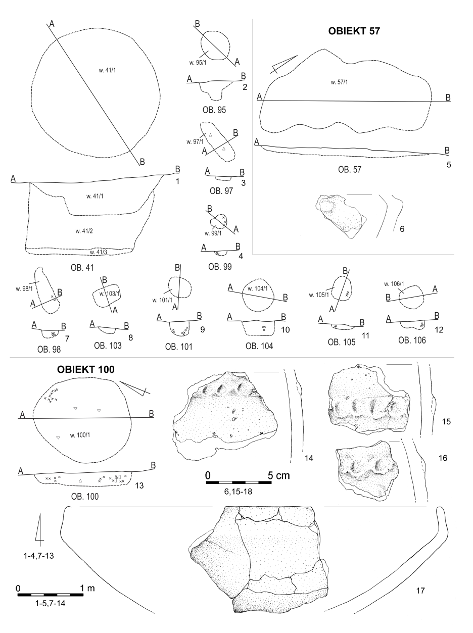 Zupełnie odrębnie należy potraktować obiekty 41, 55, oraz 57 (tabl. 2.1: 13; 2.3: 1, 5). Ich nieregularny kształt w rzucie poziomym (ob. 55 i 57) oraz wypełniska w postaci brązowej słabo zbitej ziemi z widocznymi korzeniami wskazują, że były to prawdopodobnie zaciemnienia pochodzenia naturalnego. Zostały uwzględnione w analizie ze względu na pojedyncze fragmenty ceramiki, które dostały się do ich wypełnisk wtórnie.
