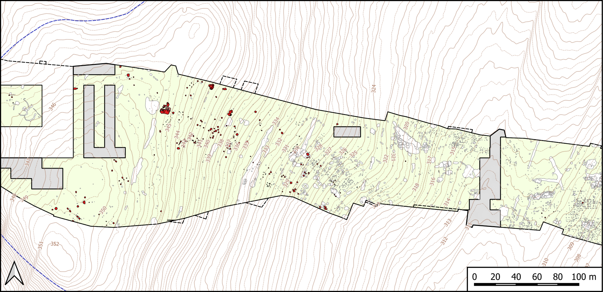 Sanok, stan. 59–60. Plan warstwicowy stanowiska z zaznaczonymi obiektami z epoki brązu i wczesnej epoki żelaza