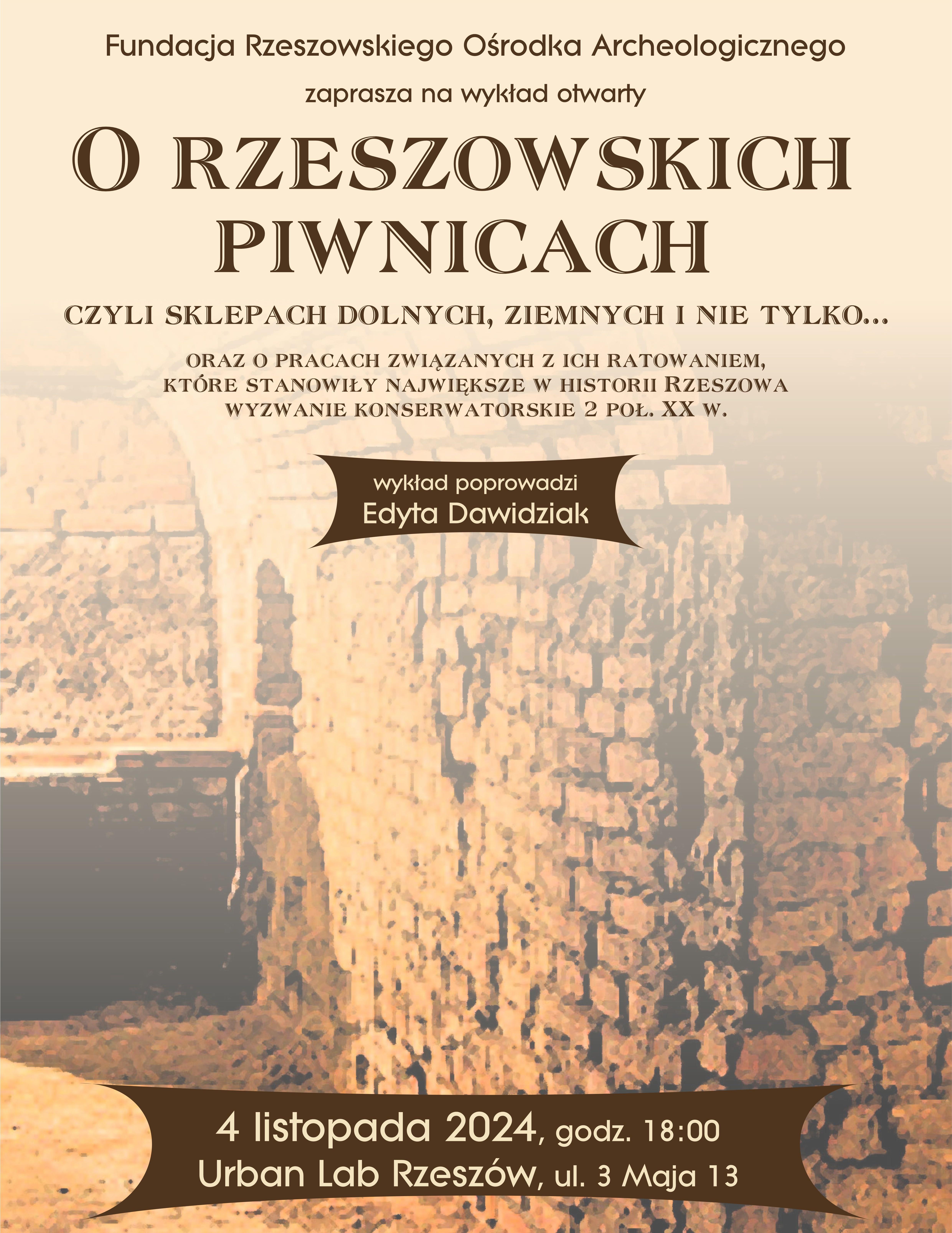 Zapraszamy na wykład poświęcony historii konserwacji i przywracania funkcjonalności piwnicom pod Rzeszowskim Rynkiem. Prace, będące największym w historii Rzeszowa wyzwaniem konserwatorskim, trwały od lat siedemdziesiątych ubiegłego wieku i złożone były z wielu etapów. Ich końcowy efekt możemy podziwiać, zwiedzając Rzeszowskie Piwnice.